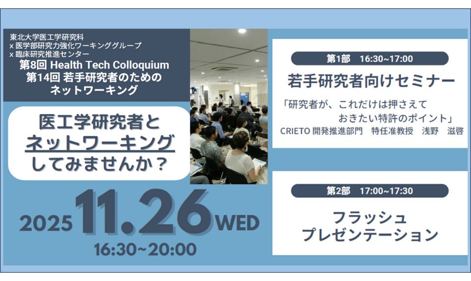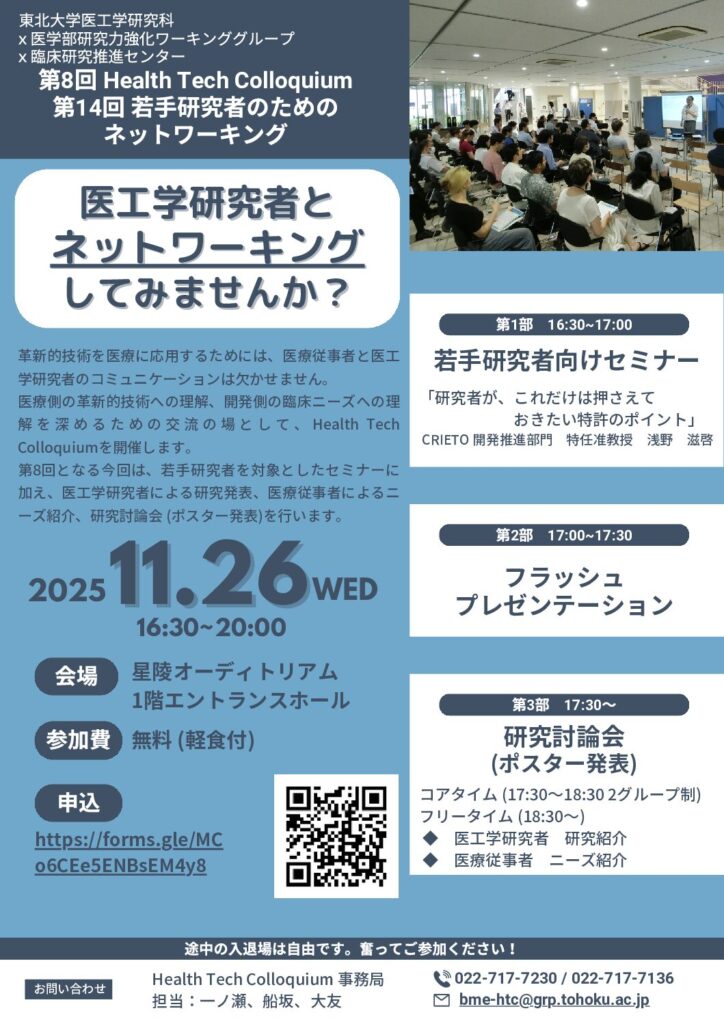 この度、医工学研究科、医学部研究力強化ワーキンググループ、臨床研究推進センターが共催し、第8回 Health Tech Colloquium/第14回 若手研究者のためのネットワーキングを開催いたします。